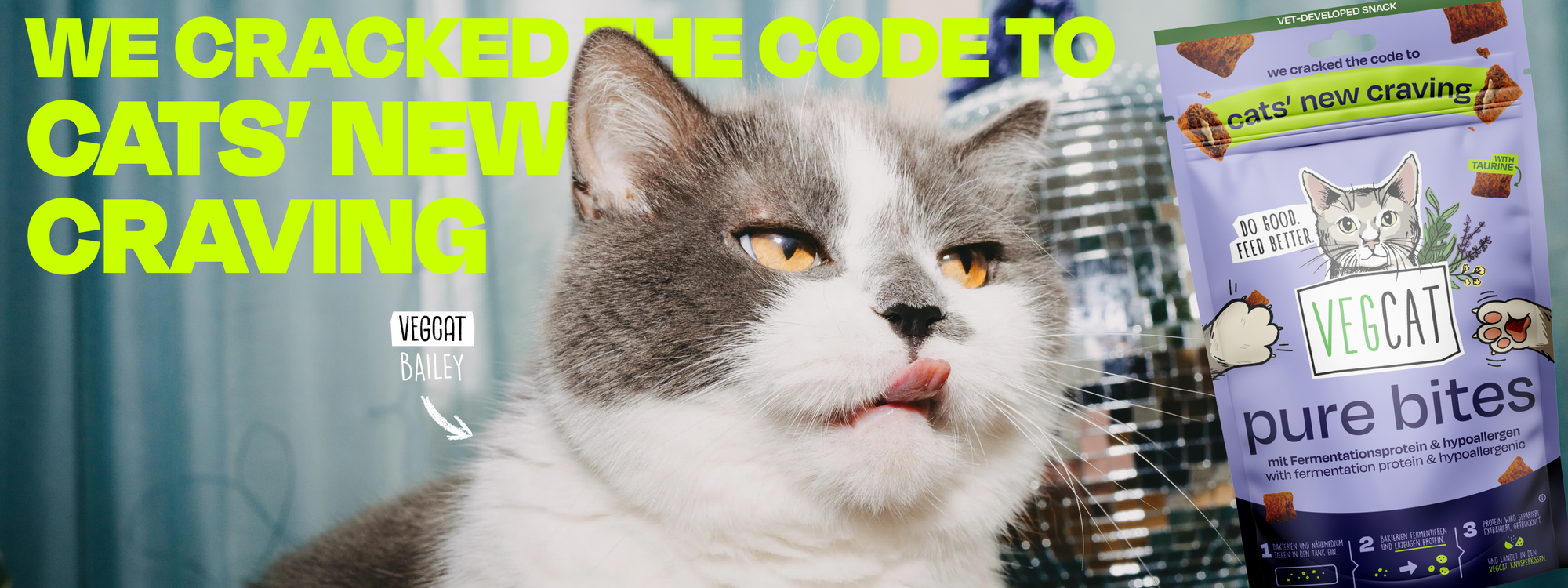 For a long time it was said that vegan and cat don't go together - we wanted to prove the opposite. And we started with the VEGCAT PURE BITES: they are the snack for all cats (and cat people) who want to combine responsibility, health and taste.